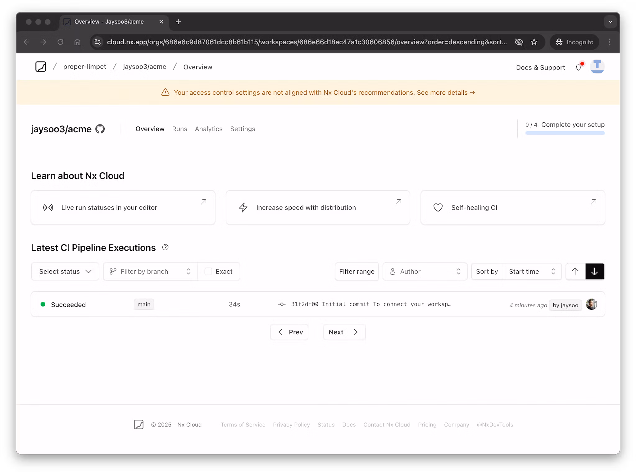 .github/workflows/ci.ymlpipeline preconfigured - You completed the full Nx Cloud onboarding and you now have a Nx Cloud dashboard that is connected to your example repository on GitHub.
